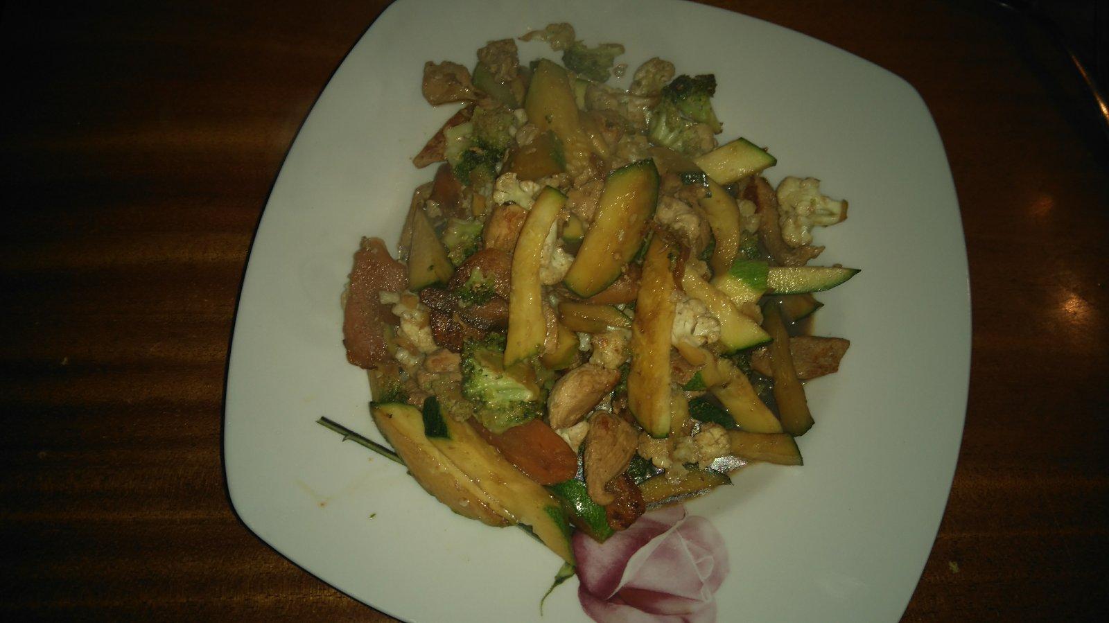 obrovská mnamka :-) orestovane morčacie prsia na olivovom oleji, pridaná mrkva,brokolica, karfiol a cuketa a zaliať troškou sójovej omáčky :-)