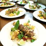 Na špízy sú nastoknuté kačacie a morčacie prsia. Všetko je grilované na grilovacej panvici, rovnako ako aj nakrájaný ananás.