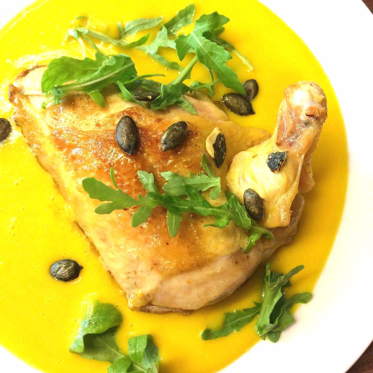 Na fotke sú kuracie prsia na tekvicovej omáčke (cibuľa, cesnak, zázvor, tekvica, kurací vývar, soľ, korenie, tymián, bobkový list, majorán, trochu chilli) s nasucho opečenými tekvicovými semienkami a rukolou.