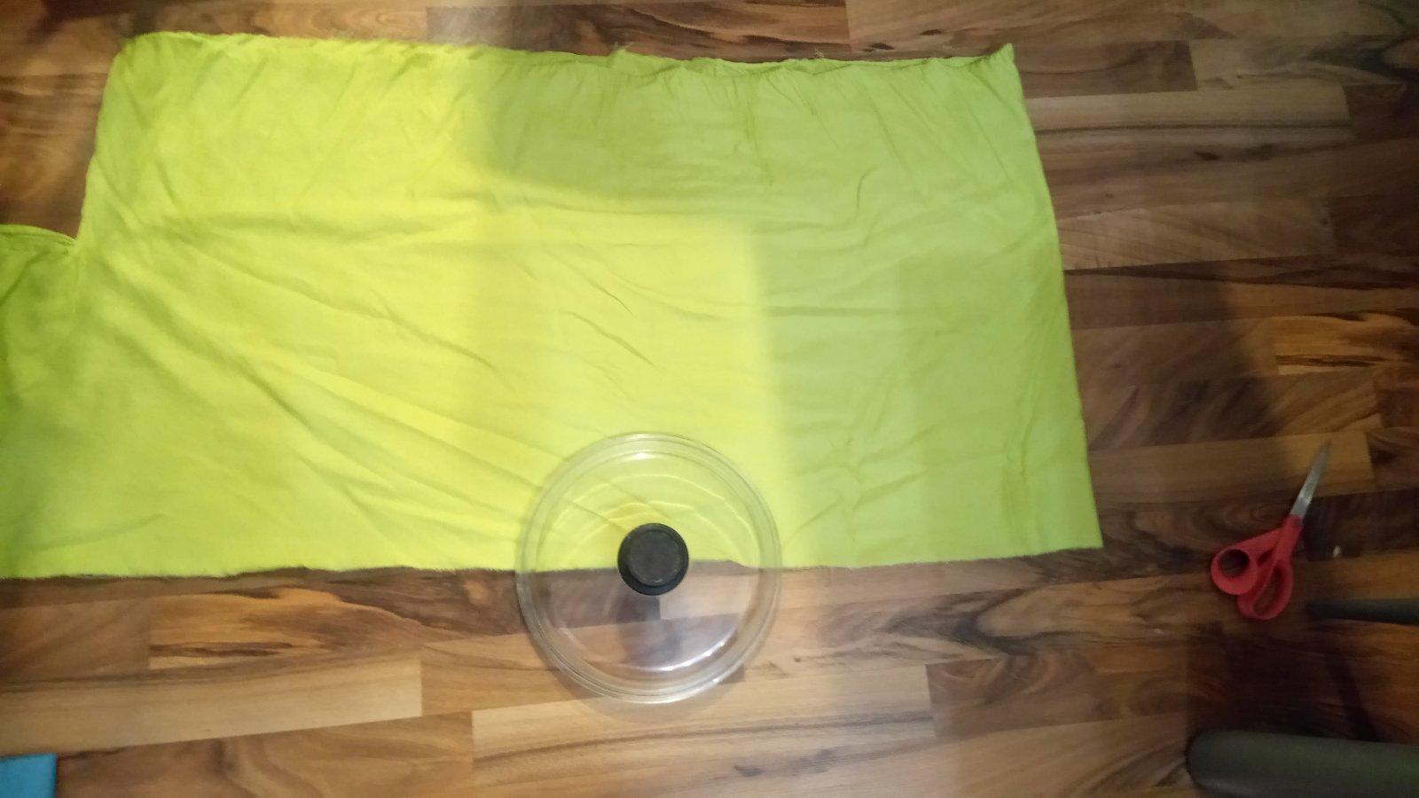 Látku si preložím na polovicu. Kruhový otvor na pás si najreslim pomocou pokrievky