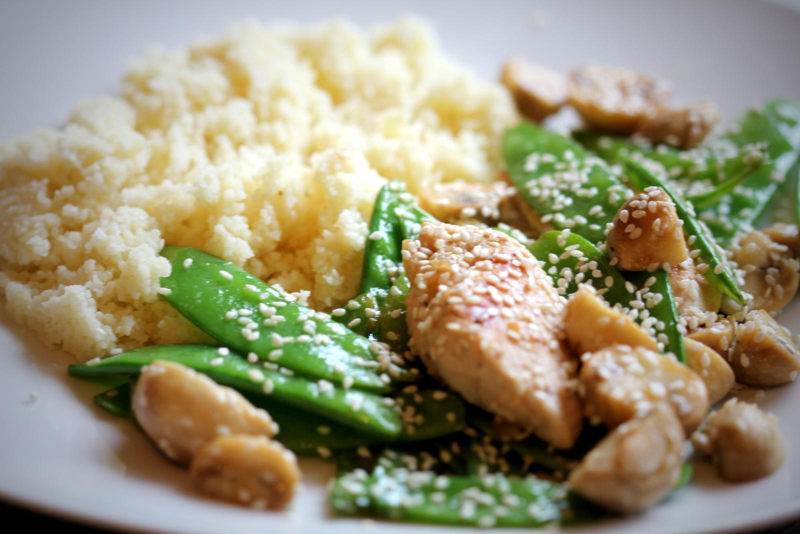 kuracie prsia,sampinony,cukrovy hrasok,sezam ..priloha kuskus
