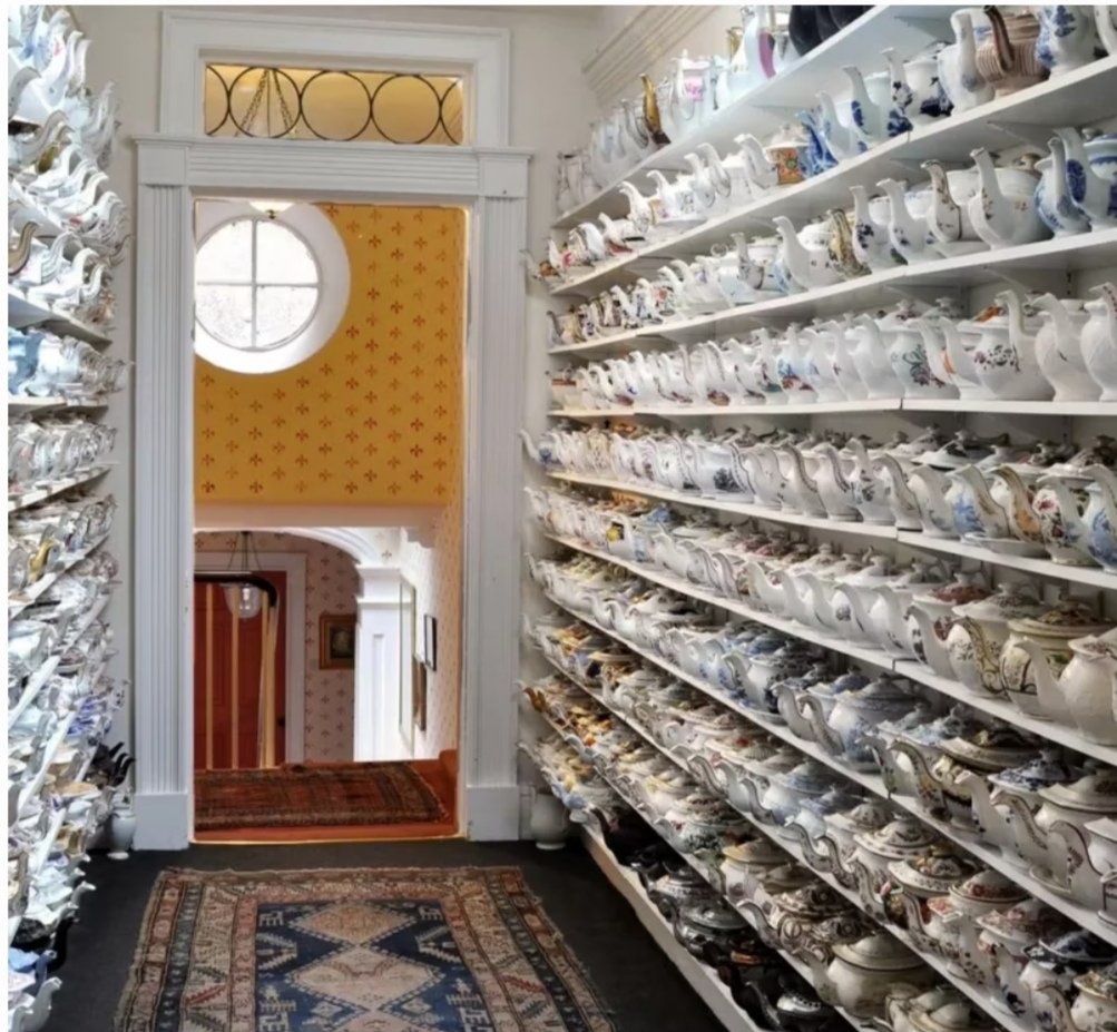 Ako tak pozeram na tu zbierku toho pana... ked ides okolo a nahodou zavadis o jeden cajnik, strhnes zo sebou aj par cajnikov co su vedla a tie potom padnu na vsetky cajniky co su pod nimi, lebo vycnievaju z polic. Tadial by som sa bala prejst.