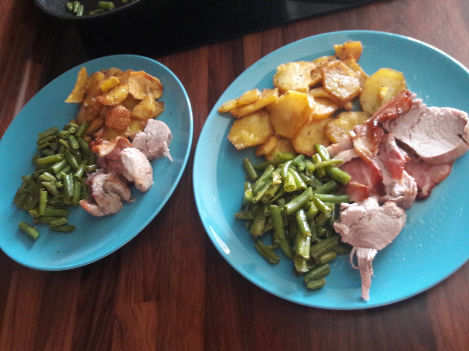 Bravcova panenka so slaninkou, pecenymi zemiakmi a fazulovymi luskami
