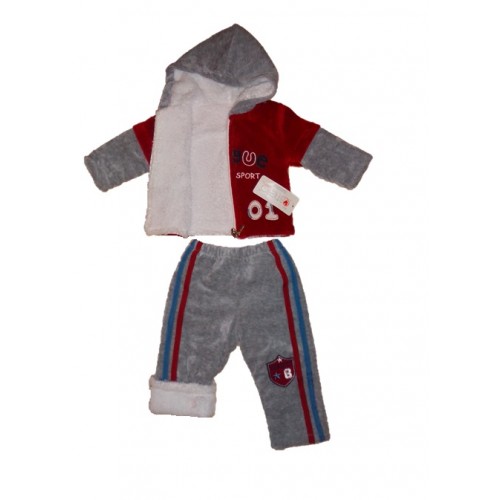 Chlapčenská flísová súprava s výšivkou mini sport01 na mikine a s výšivkou aj na ľavej nohe teplákov, po vonkajšej dĺžke teplákov sú pásy modrej a červenej farby, vnútro mikinky a teplákov je zateplené. Zloženie 100% bavlna.