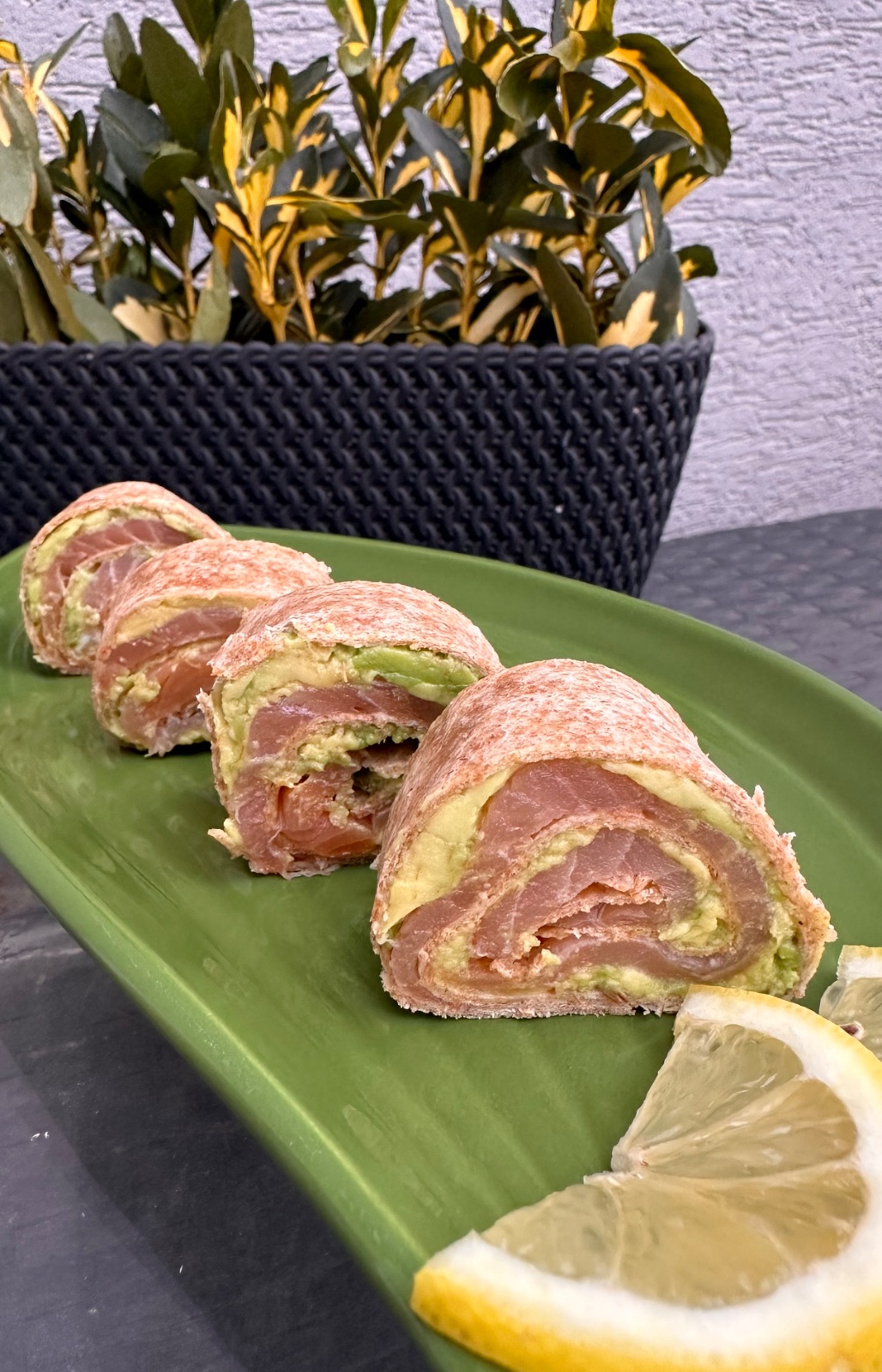 Celozrnná tortila s rozmačkaným avokádom, soľ, korenie, na to plátky údeného lososa, pokvapkať citrónom a zrolovať.
