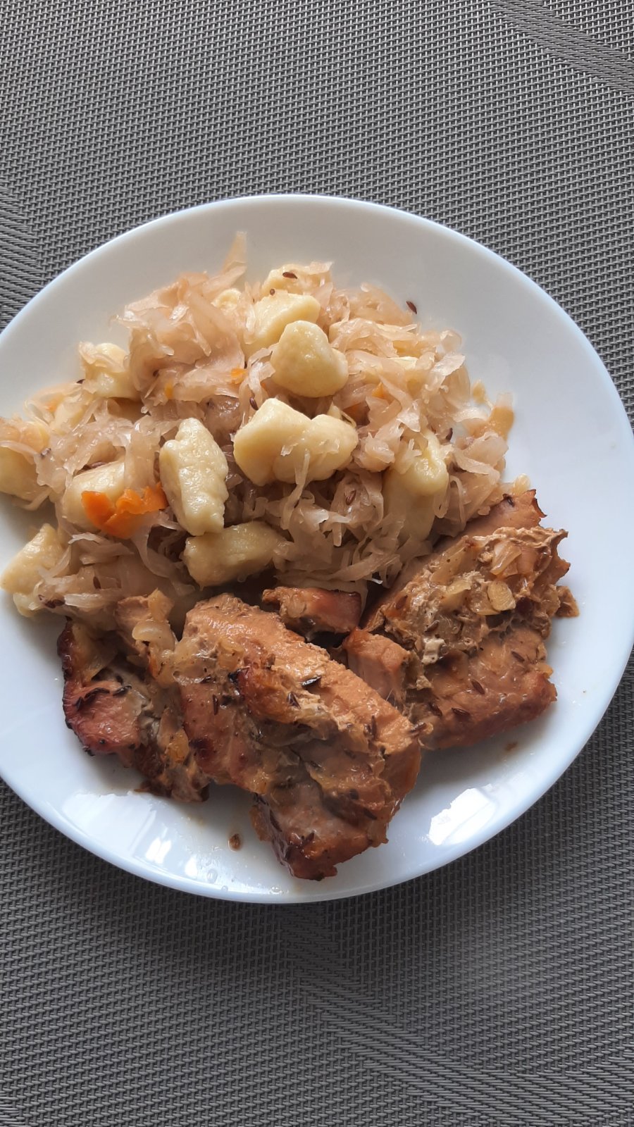 Zemiakové kotlíky s kyslou kapustou a pečené maso