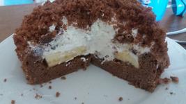 muku zmiesame s pp a kakaom, vajcia vyslahame s cukrom a roztopenym maslom, pridame muku s kakaom a postupne podla potreby pridame mlieko. Upecieme v 24cm tortovej forme na 180°C cca 30 min. Po vychladnuti vydlabeme vnutro, mozeme poliat kompotovou stavou, pre dospelych mozme dat trochu rumu, poukladame banany, natrieme plnkou do tvaru kopule a na vrch namrvime vydlabane vnutro. Nechame chvilu odstat v chladnicke, kludne aj do druheho dna. Plnka - vyslahame slahacku s cukrom a so stuzovacom. Ak dame rastlinnu slahacku stuzovac netreba. Zlahka vmiesame kysle smotany, hrozienka a cokoladu. Treba dat pozor aby sme nedali plnku na teply korpus, musi byt uplne vychladnuty.