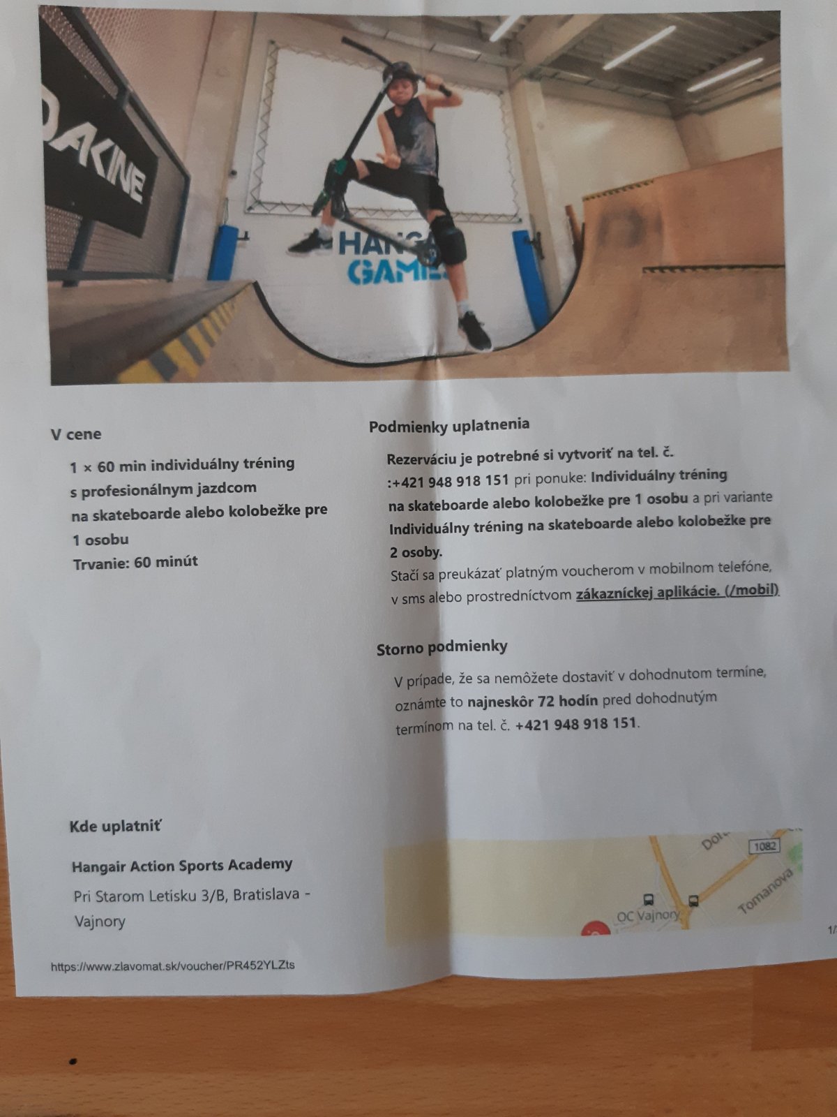 Aktual. DAROVANE...Individualna hodina/trening na skateboarde alebo kolobezke v Hangair v Bratislave... nemal by niekto zaujem? Kupene cez zlavu, povodne do 1.6. platne, ale kvoli situacii to predlzovali a urcite viem ze mali napisane na stranke (ale uz nemaju) ze do oktobra, ale neviem ci iba do prveho alebo do konca mesiaca sa to da vyuzit. Syn dostal ako darcek na Vianoce, len uz to nestihneme vyuzit, tak rada by som darovala, ak to niekto vyuzije🙂