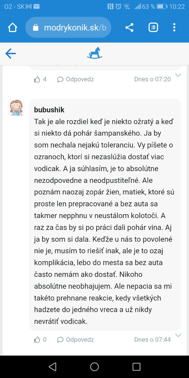 Tak je ale rozdiel keď je niekto ožratý a keď si niekto dá pohár šampanského. Ja by som nechala nejakú toleranciu. Vy píšete o ozranoch, ktorí si nezaslúžia dostať viac vodicak. A ja súhlasím, je to absolútne nezodpovedne a neodpustiteľné. Ale poznám naozaj zopár žien, matiek, ktoré sú proste len prepracované a bez auta sa takmer nepphnu v neustálom kolotoči. A raz za čas by si po práci dali pohár vina. Aj ja by som si dala. Keďže u nás to povolené nie je, musím to riešiť inak, ale je to ozaj komplikácia, lebo do mesta sa bez auta často nemám ako dostať. Nikoho absolútne neobhajujem. Ale nepacia sa mi takéto prehnane reakcie, kedy všetkých hadzete do jedného vreca a už nikdy nevrátiť vodicak.