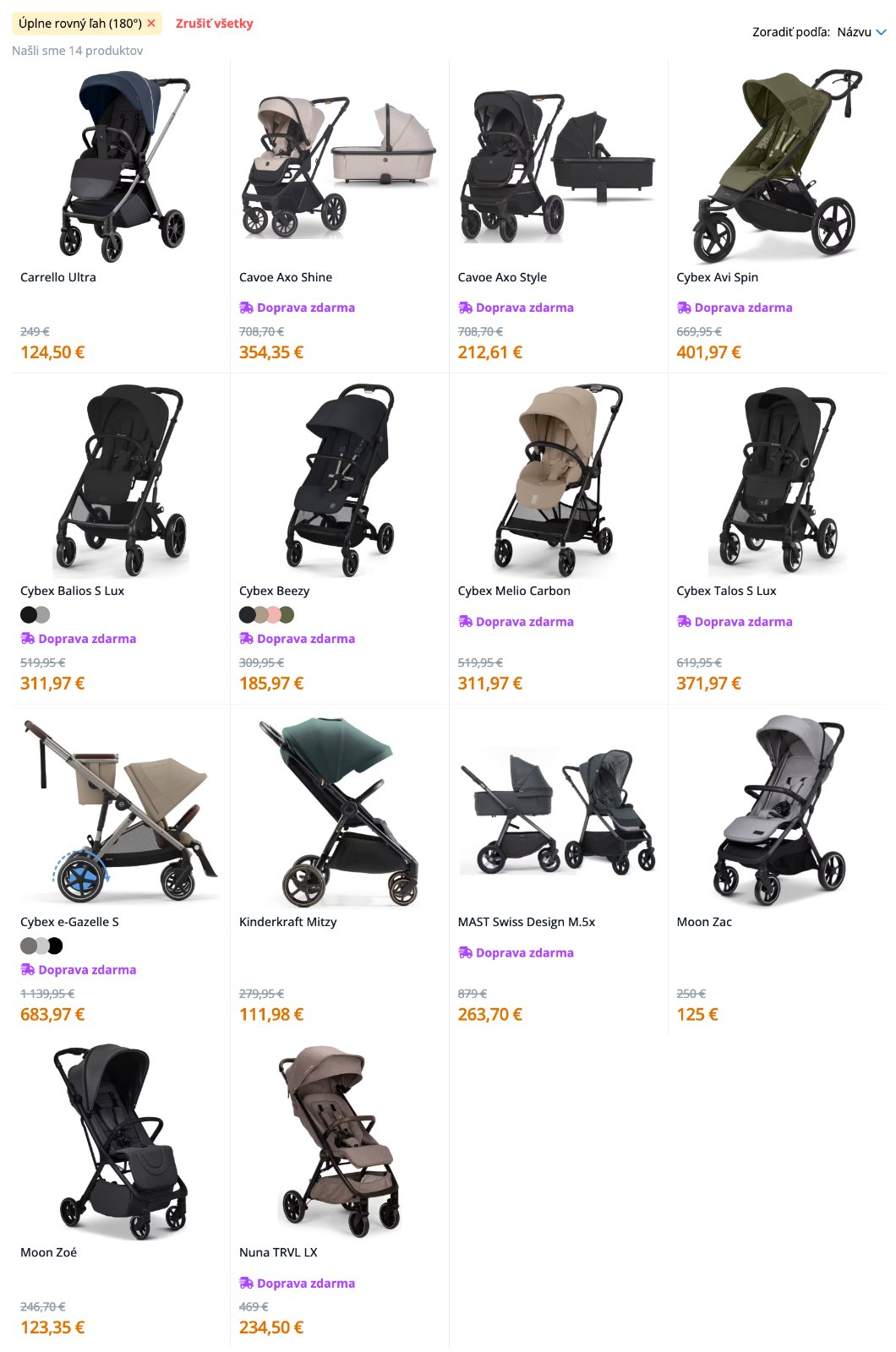 Každý športový kočík má odpočinkovú polohu pre dieťa. Pokiaľ vaše dieťa v kočíku spí a záleží vám na tom, aby odpočívalo v úplne vodorovnej polohe, hľadajte kočíky s úplným ľahom (180 stupňov). So 😈 zľavou 😈 u nás môžete kúpiť tieto: https://www.mamaleto.sk/collection/sale-strollers/