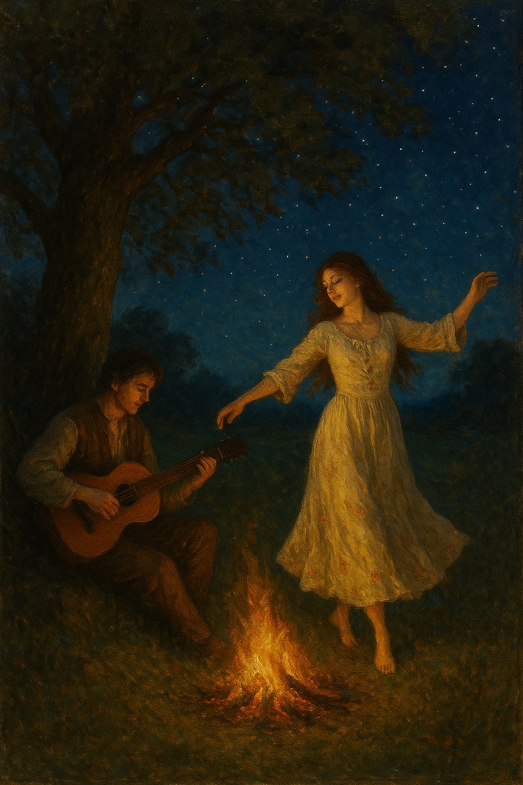 Vŕba nad nimi si šepká svoj večný príbeh, hviezdy ticho sledujú, ako sa muž a žena menia na melódiu a tanec, na dych a pulz, na túžbu a oheň.