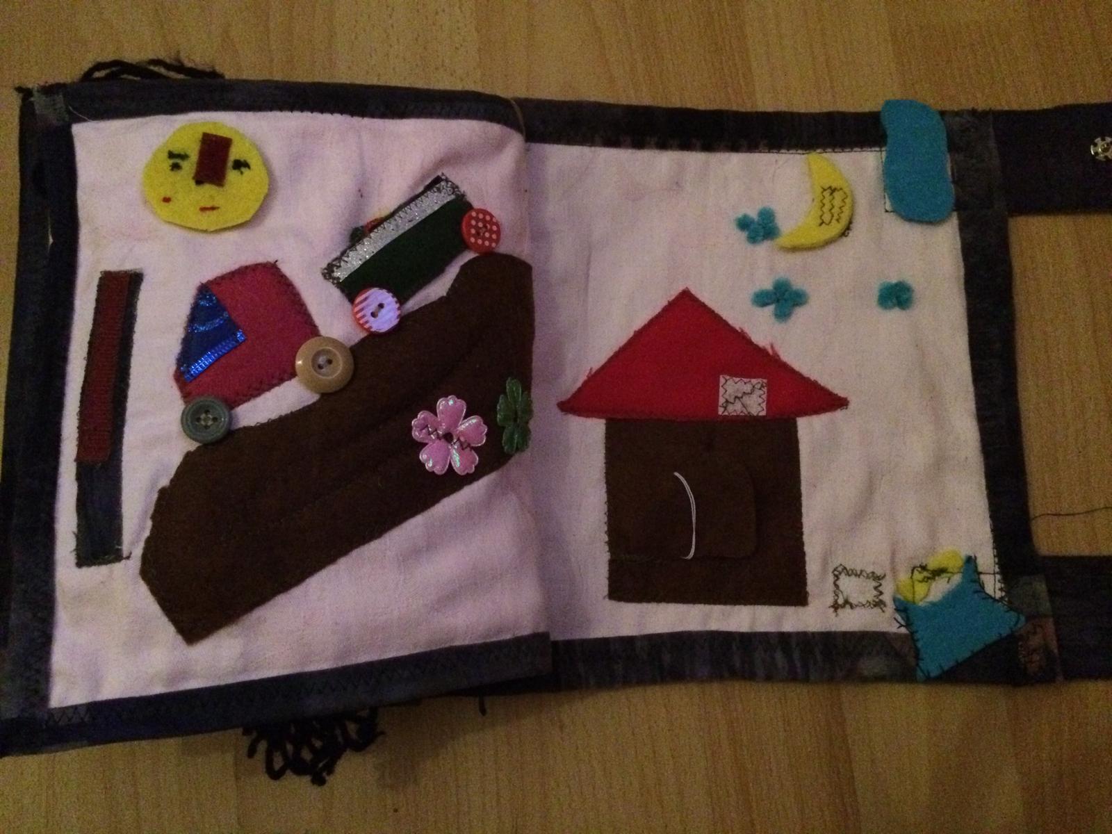 Na ľavej strane sa dieťa naučí semafor ktorá farba čo znamená,na pravej strane je psia búda,cez deň psík spí v búde a na noc ho púšťame z búdy aby strážil dom.