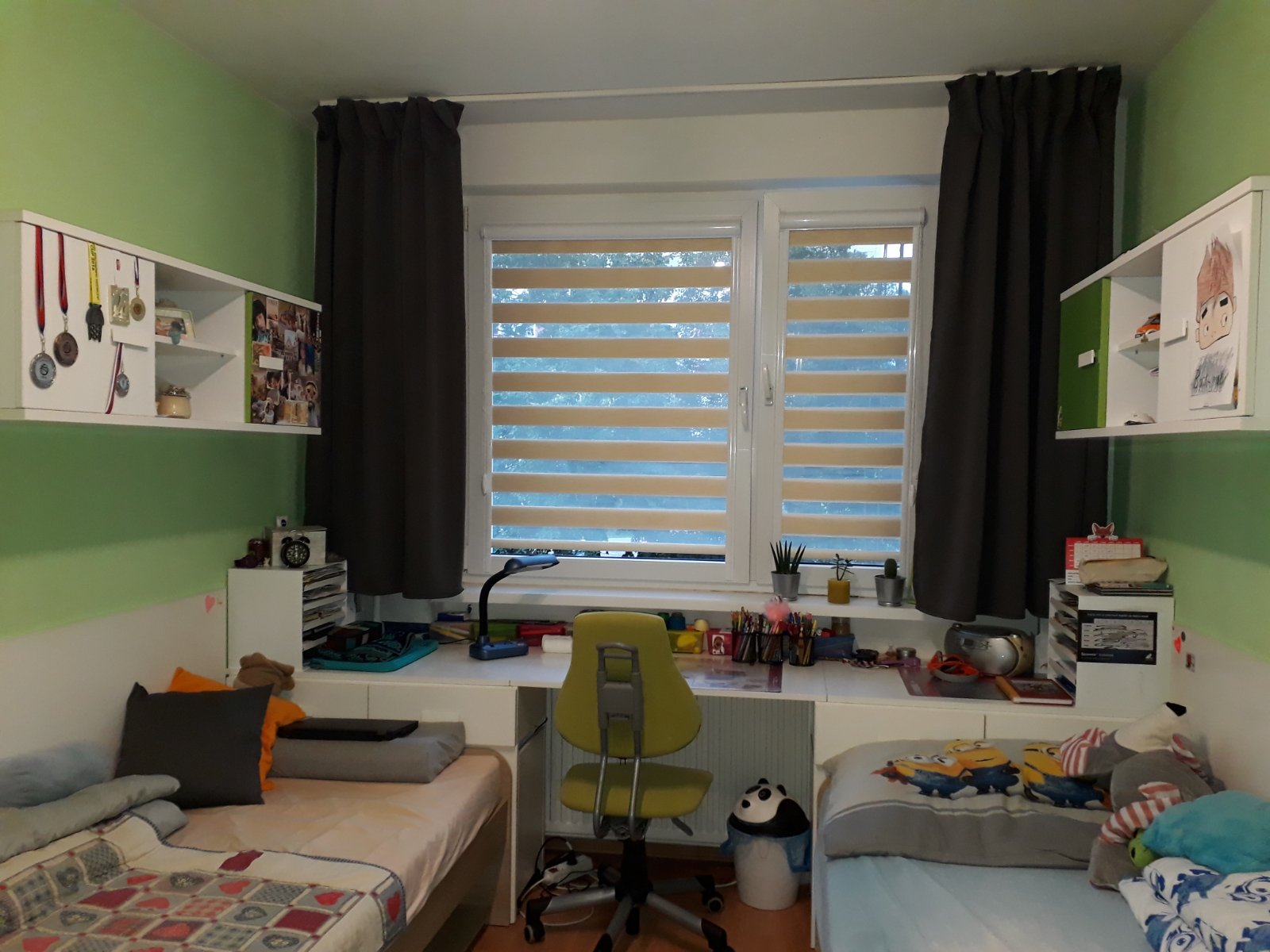 Dajte tipy ako ste riešili malé izby pri 2 deťoch školákoch?máme šírku izby 3,25(šírka)x4,20 dĺžka.mladsi od septembra nastupuje do školy tak potrebujeme prerobiť izbu.mali sme poschodová posteľ,ale sme ju rozdelili.izba je neštastne riešené,zarubna je skoro v strede izby,okno takisto,poschodová posteľ sa dá dať len na jednu stranu,za dverami máme skrine.