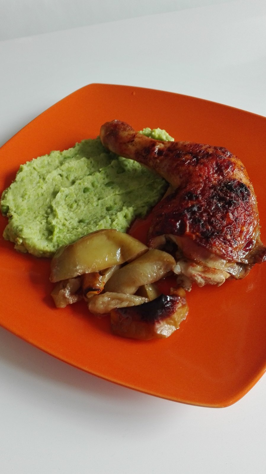 Kur.stehno na jablkách s hráškovým pyré