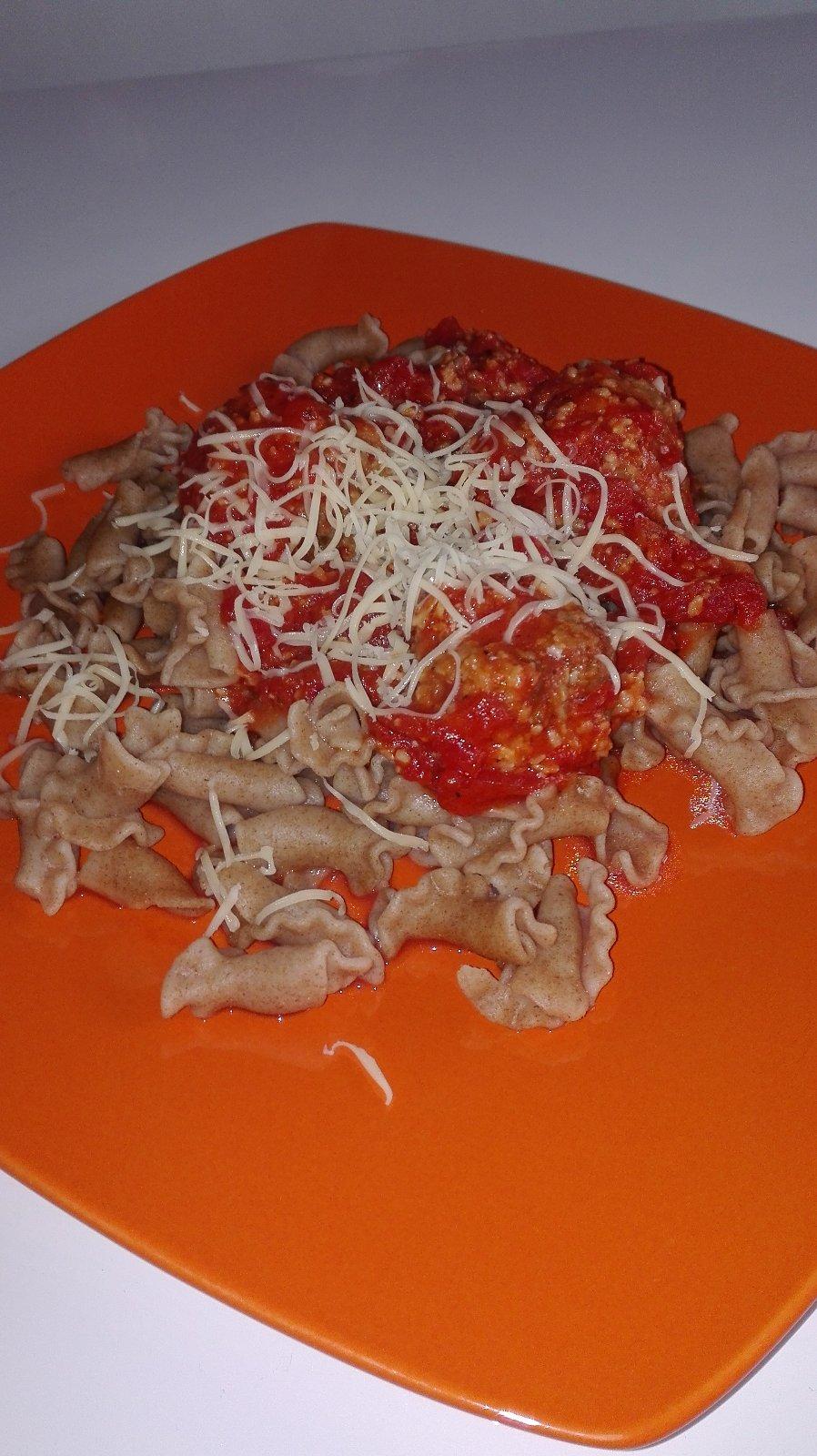 Celozrnne cestoviny s guľkami z hovädzieho maska obalene v sezame v paradajkovej salse