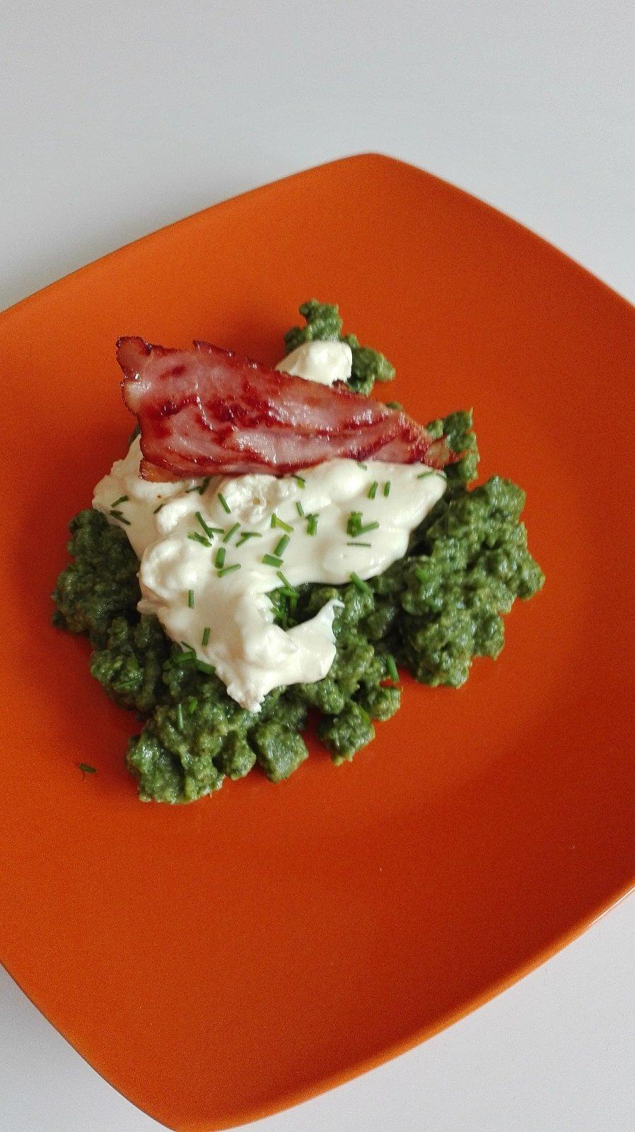 spenatove halusky s balkanskym syrom a prosuto chips