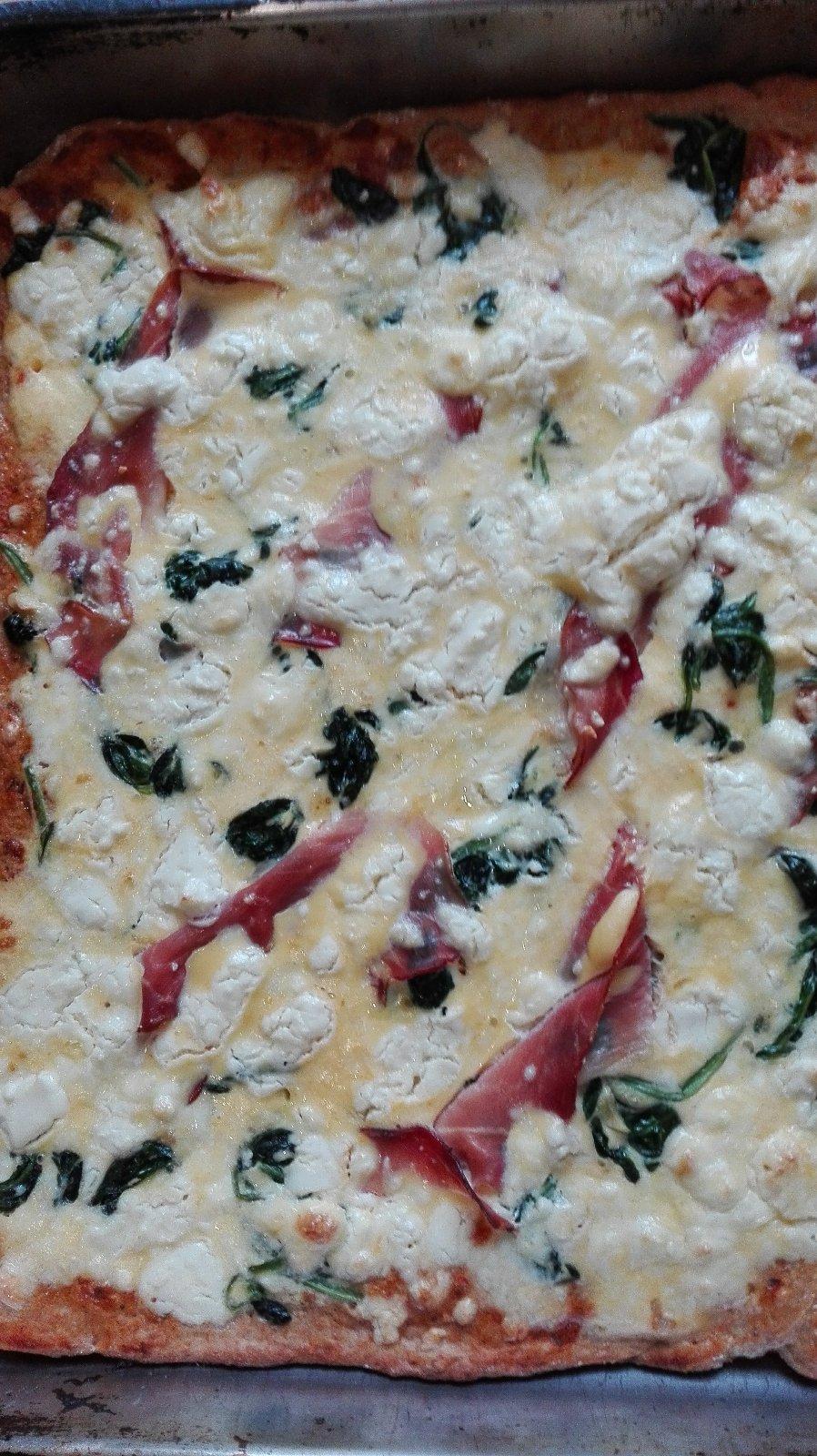 spaldovy celozrnny kolac so spenatom,fetou a prosutom