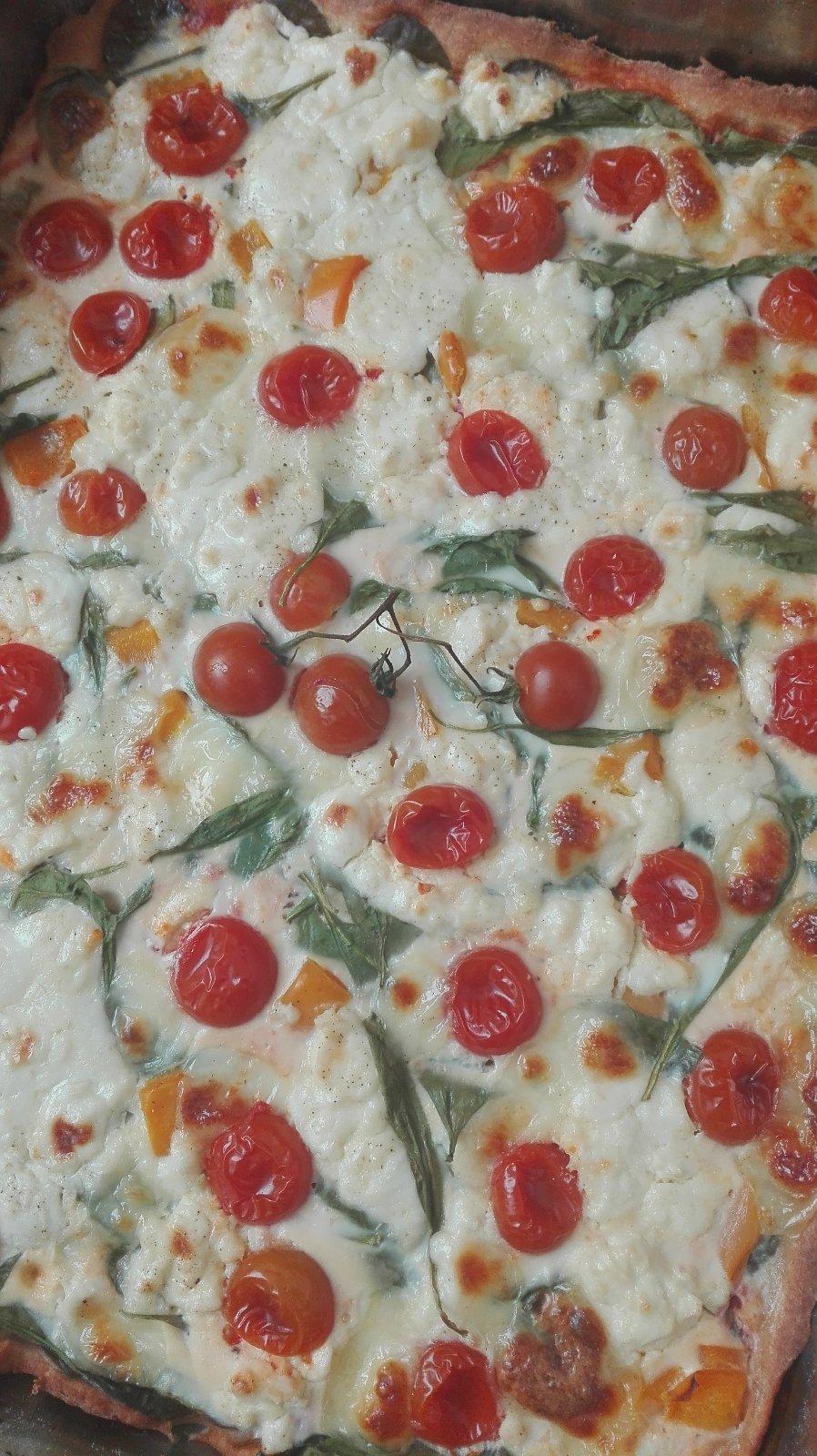 Vsetky suroviny na cesto som si zmiesala v miske a miesila som dokial mi nevzniklo hladke nelepive cesto. Z cesta som vyformovala mensi bochnik, zabalila so potravinarskej folie a dala som na 30 min. do chladnicky. Po 30 min. som cesto vybrala, rozvalkala a prelozila do formy. Cesto som prstami popritlacala aj na okrajoch a poprepichovala vidlickou aby sa pri peceni nenafuklo. Takto pripravene cesto som potrela rajcinovým pretlakom s cesnakom, poukladala umyte listky cerstveho spenatu, nakrajanu mozzarellu,podrvila balkánsky syr poukladala cherry rajčiny-polovičky. Dochutila solou a korenim a zaliala rozslahanym vajickom s mliekom. Piecť pri teplote 200 st. cca 25-30 min.