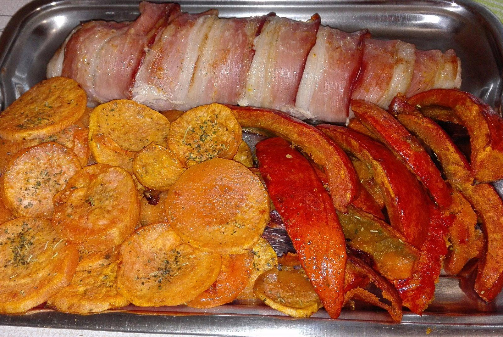 Panenka v slaninke +pečena Hokaido a bataty