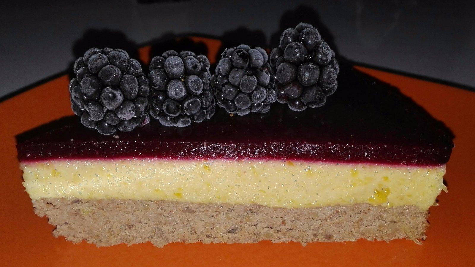 Bez muky 1vrstva-gastanove pyre+orechy+vajicko 2vrstva mango pyre+tvaroh+zelatina 3vrstva lesne ovocie pyre+zelatina