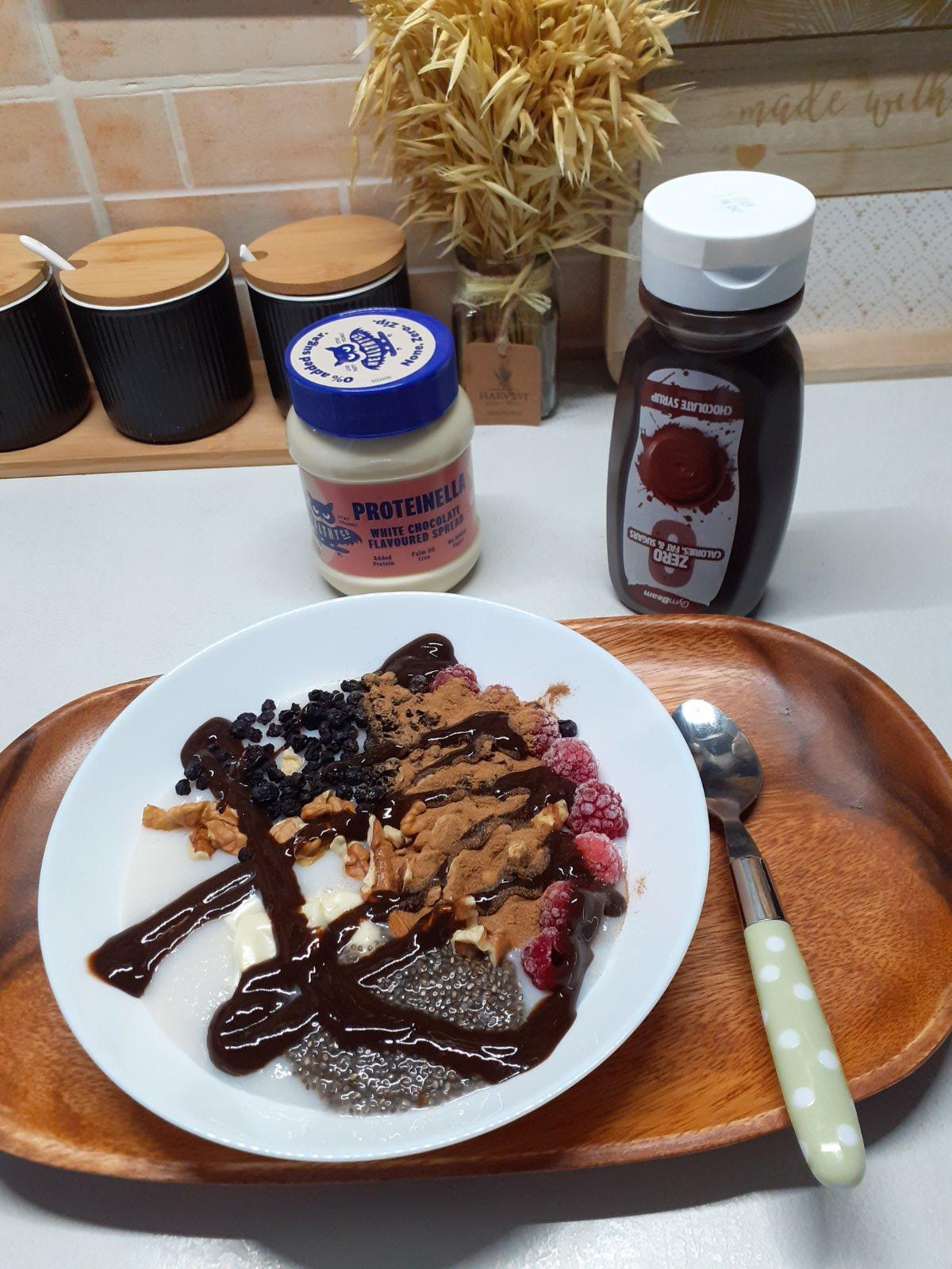 Ryzova kasa s chia,maliny,orechy,proteineella,liofilizovane cucoriedky,jablkova vlaknina