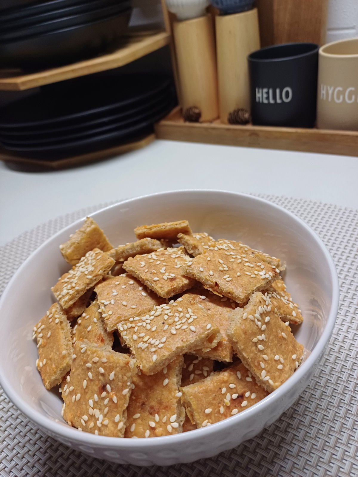 140g eidam140g chedar2 vajíčka2 PL olivový olej6 PL špaldová celozrnna múkaVsetko spolu vymiesiť a rozvaľkať medzi 2 mastnými papiermi,vrchný odobrať,preloziť cesto na plech a narezať radielkom.Piecť 180st.cca.15-20min do zlatista