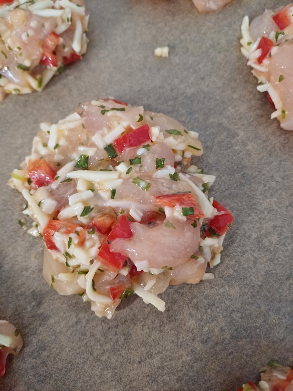 Všetko spolu zmiešať a s lýžicou nakladame na plech vystlaný mastným papierom,pofrkáme olivovým olejom a pečieme v rúre 200st.cca.25-30min.