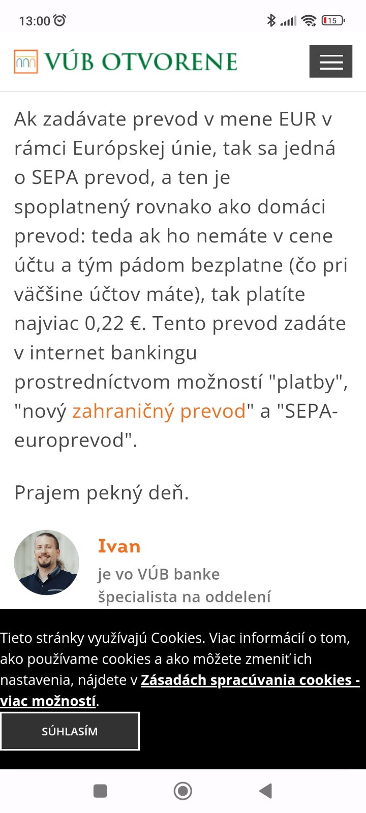 Nevie prosim niekto kolko si uctuje VUB za poslanie penazi cez internet banking zo slovenskeho senior uctu na normalny cesky?