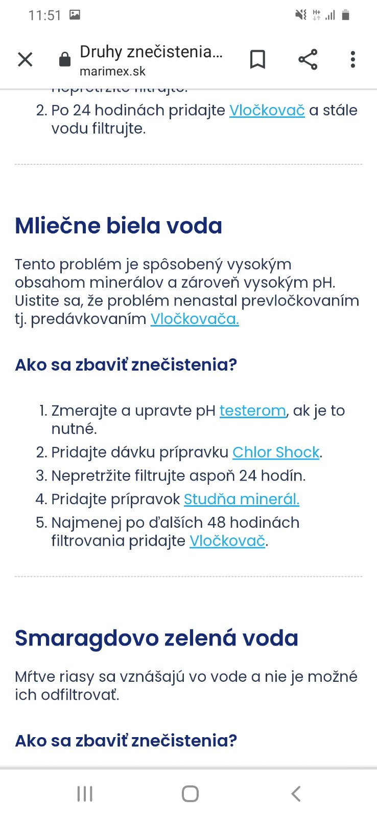 Prosím kto sa vyznáte, napustili sme bazén vodou pitnou, upravili ph vody, vo vode je stále plavák s chlorovou tabletkou, dali aj zmakcovac vody, filtrácia beží, voda je čistá ale trošku mliečna akokeby dobiela, čo pridať ?