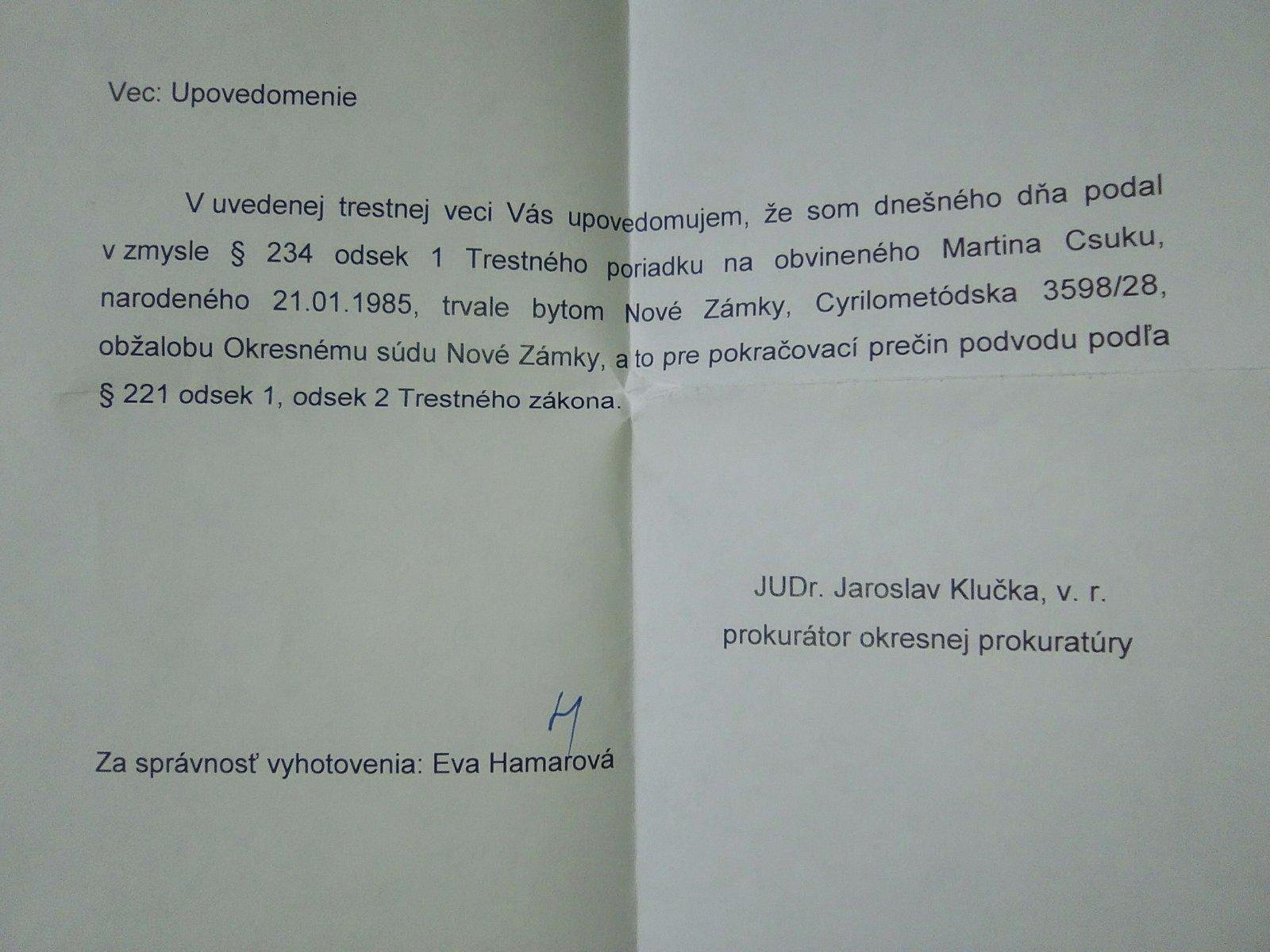 Tunajšie Obvodné oddelenie PZ Prievidza pod sp. zn. ČVS:ORP-1253/PD-PD-2014 vykonáva policajné preverovanie z podozrenia z pokračovacieho prečinu podvod podľa §221 ods. 1 Trestného zákona, ktorého sa mala v priebehu roku 2014 na internetovej stránke www.modrykonik.sk dopustiť osoba/osoby pod menom Martin Csuka resp. Melánia Čuková, ktoré používali tel.č.: 0902 774 386, 0940 554 451 a komunikovali s poškodenými cez emailové adresu: larala@centrum.sk