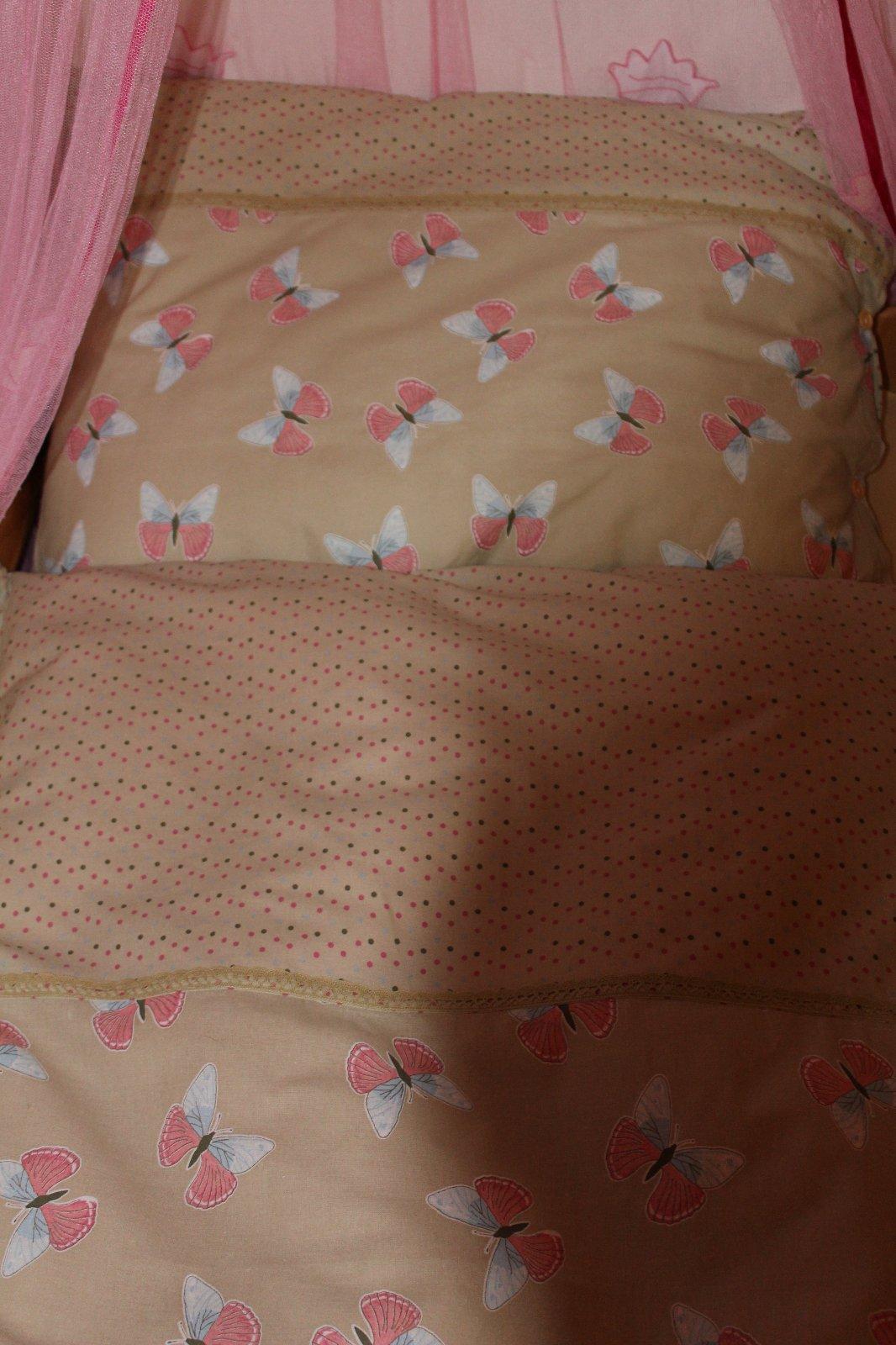 Obliečky pre slečnu z motýlikovej kolekcie, dostupnosť týchto látok je nutné predom preveriť. 100% bavlna. Drevené gombíky a paličkovaná čipka takže všetko prírodné materiály .