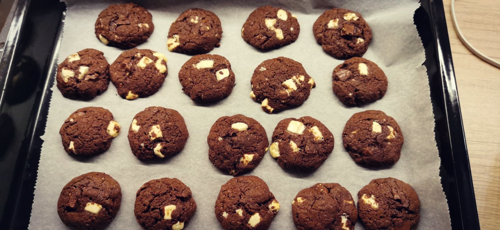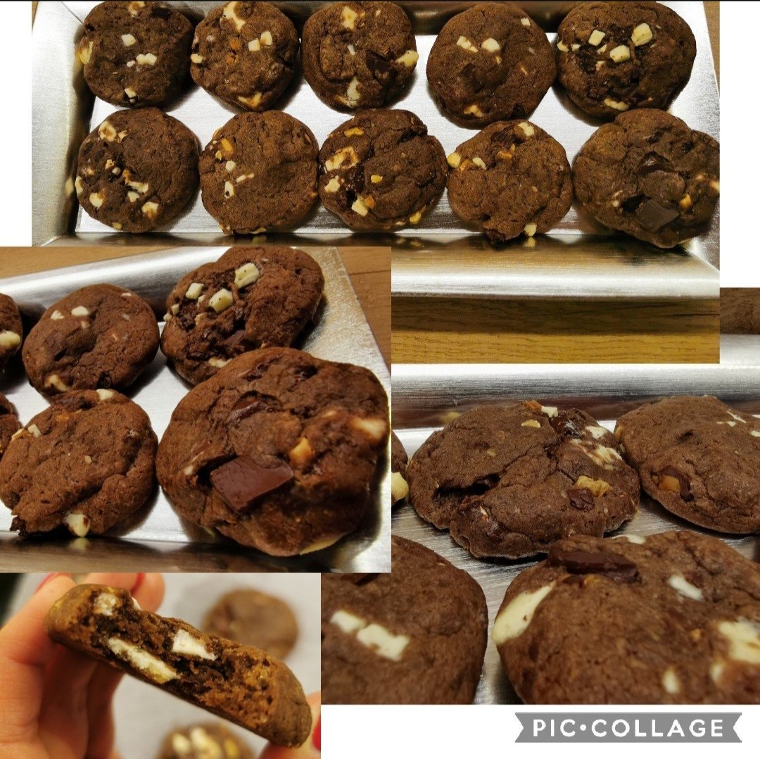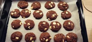 150g maslo, 100g cukor z kokosovych kvetov vyslahat pridat 1 vajicko uz ked je vyslahane tak pridat cokoladove pikao v plechovke nie cele davam od oka, preosiala. Som farina muku na zaciatok 280g potom som oka podla konzistencie pridavala, sol, 1/2kl kypriaci prasok, pridat cokoladovu hmotu, vanilku, kusky cokolady, nechat odstat v chlade aspon hodinu piect na 180 10 min