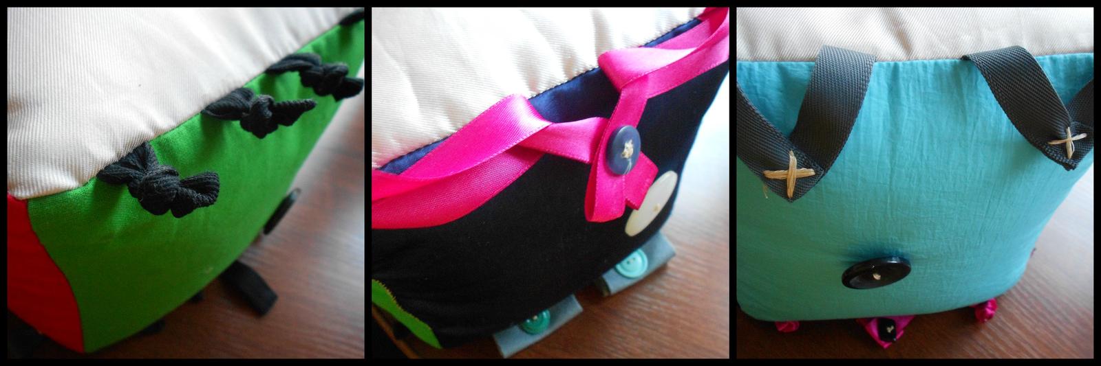 Potrebovať budeme hlavne to, čo nájdeme doma. Ja som našla 6 odlišných látok, ktoré boli iné nielen farebnosťou, ale aj zložením. Je tam lesklá, matná šušťavá, no proste všetko, čo by mohlo chlapca/dievča zabaviť 🙂 Dôležitú súčasť tvoria stuhy, špagátiky, hrubšie gumy a rôzne iné veci, ktoré nájdete vo vašej domácnosti. Gombíky, nožnice, výplň, (ja som použila také tie guličky, čo sa dávajú do sedacích vakov), nite a šijací stroj. A skoro som zabudla - lepivá výstuž. Tá vám veľmi pomôže, pokiaľ budete mať neposlušné látky.