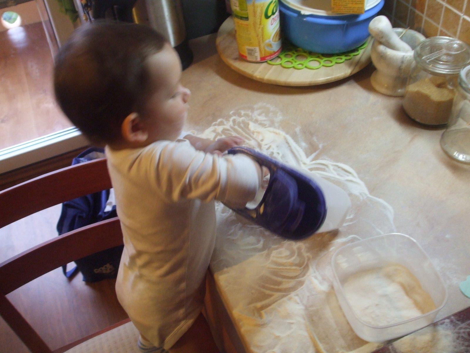 jej, krasne 🙂 ja mam v detstve na to krásne spomienky. mam o 7 rokov mladsieho brata a ked sme boli v kuchyna a mama varila, tak dala bratovi dosku na cesto a posypala mukou, dala mu autícka a vedel sa tak hrat hodiny :D môj maly ked trosku vyrastie urcite tiez skusime 🙂 krasny chlapcek 🙂