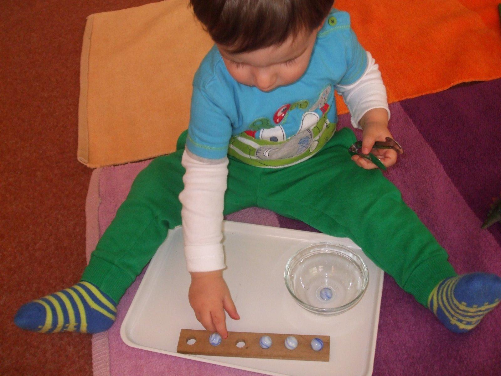 ...ukladanie guličiek klištikmi, ale ešte ich nevie správne stlačiť a uchopiť tak guličku, tak ich dával rukami :-)