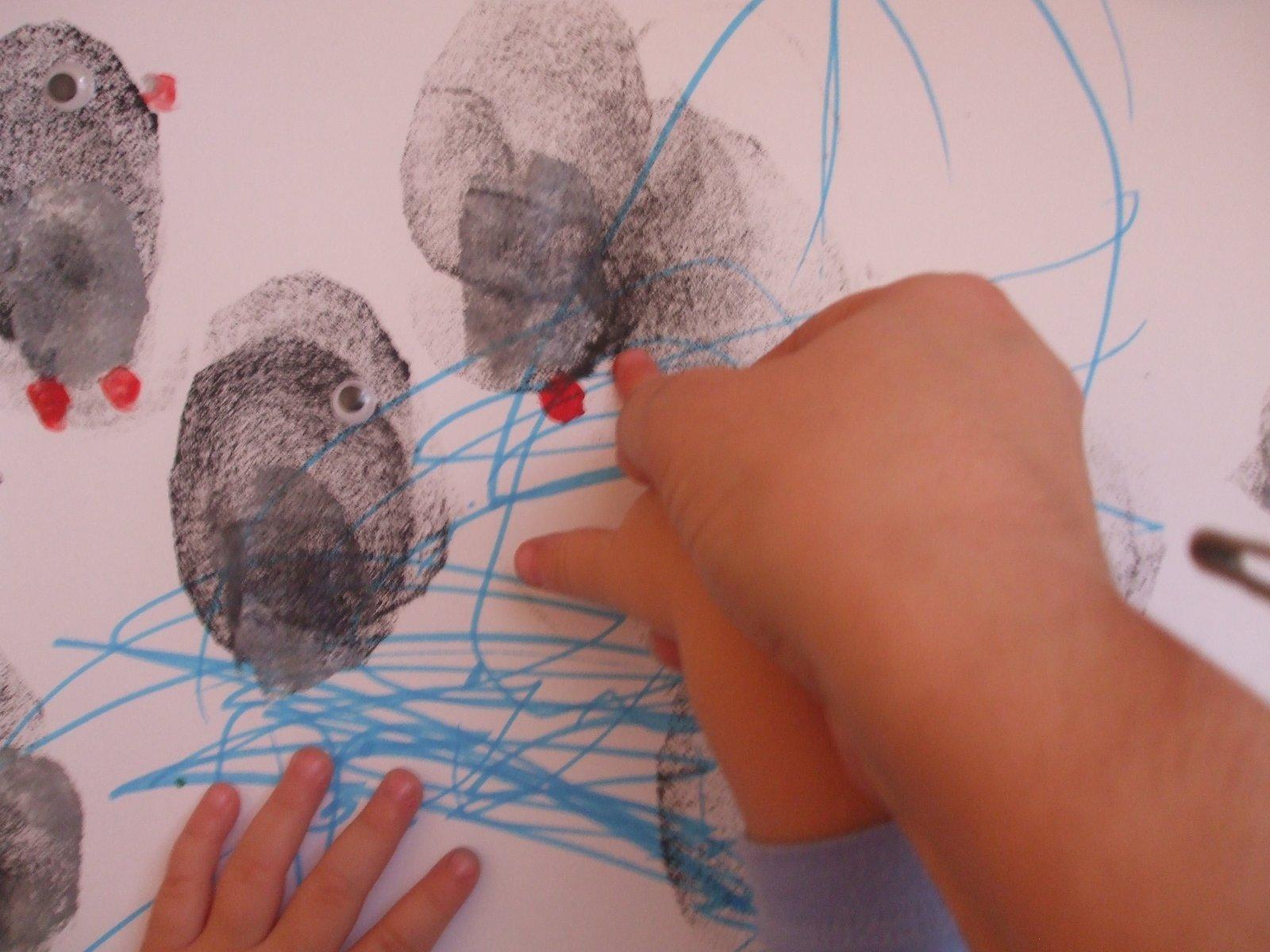 Potom sme lepili pohyblivé očká (Adamkovi to šlo ťažko, lebo očká sú maličké a zle sa mu držali, tak som mu pomáhala) a prštekom sme robili nožičky a zobáčik našim tučniakom.
