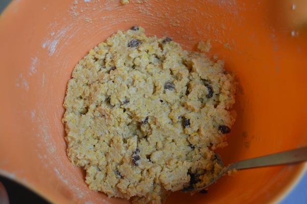 120 g rozdrvených kukuričných lupienkov, 100 g múky, 125 g masla, 100 g cukru, 1 vajce, 1 malú lyžičku bezfosfátového prášku do pečiva, hrozienka