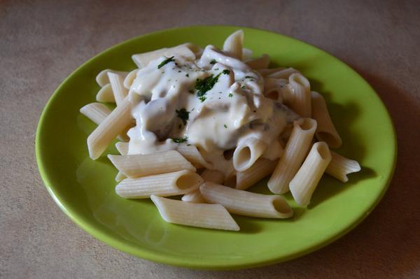 Penne som uvarila podľa návodu v osolenej vode s kvapkou olivového olej. Na masle som spenila trošku cibuľky, šupla na to šampióny a orestovala som ich do mäkka, priliala som smotanu na varenie a po prevretí som do nej rozpustila tri črievkové syry a natrhala jednu mozzarelu. Nechala povariť a potom už len naaranžovala na tanier a posypala petržlenovou vňaťkou.