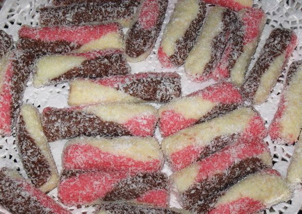 Ingrediencie 250 g kokosu 100 g sušeneho mlieka 1 salko Kakao Inštrukcie z kokosu, sušeneho mlieka a salka si spracujeme cesto.rozdelime na dva,alebo tri diely.. (ak vam nevadi potravinarske farbivo na tri diely..ja farbivo nedavam) jeden diel zafarbime kakaom..vyvalkame valceky,prepletieme ich,nakrajame a obalime v kokose