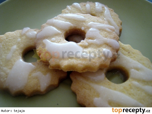 Citrónové prstienky Ingredience: Cesto: 150g hladkej múky, 2 žĺtky, 1 lyžička prášku do pečiva, 100g hladkej kukuričnej múky, 100g masla, 80g práškového cukru, kôra z 1 citrónu Poleva: 20ml citrónovej šťavy, 80g práškového cukru Postup: Všetky ingrediencie na cesto vymiešame do kompaktnej hmoty a necháme 1 hodinu v chladničke odstáť. Cesto potom vyvaľkáme a vykrajujeme z neho zvolený tvar. Vo vyhriatej rúre na 180°C.