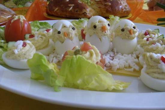 Vajcia uvaríme a ošúpeme. Vyberieme žĺtok a urobíme vajíčkovú pomazánku - zmäknuté, nie roztopené máslo vymixujeme s postrúhanými na malom strúhaku vajíčkami, pridáme na drobno nakrájanú cibulku (kto nemá rád, nemusí dávať, alebo môže prelisovať). Pridáme horčicu, tatarskú, soľ a vegetu podľa chuti. Všetko spolu vymiešame a naplníme vajíčka. Pridáme čiapočku a je hotovo. Dobrú chuť