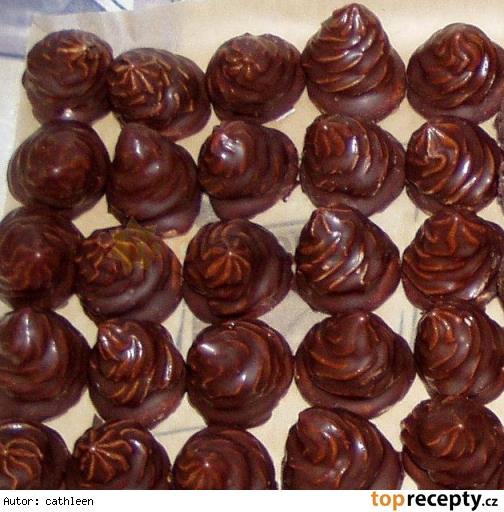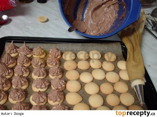 Nugetu, máslo a vaječný koňak ušleháme do krému, nastříkáme špičky na piškoty a dáme zchladit. Pak je namáčíme do polevy