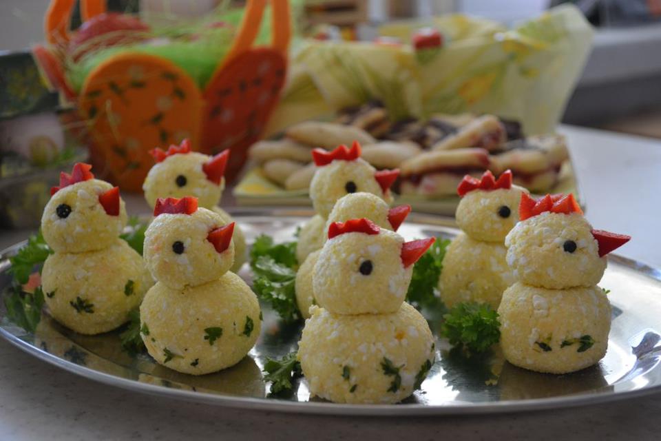 Priprava na velku noc 😀 Na dnešnom veľkonočnom stole - jednoduché a rýchle stačí zmiešať tvaroch asi 70g, postruhaný tvrdý syr asi 100g, 2 vajíčka na tvrdo a 50g maslo, soľ, korenie všetko zmiešať a tvarovať guličky na kuriatka - z týchto počtov vám vyjde asi 8 kuriatok. A potom len urobiť očka z korenia, chvostík z petržlenovej vňate a z červenej papriky zobáčik