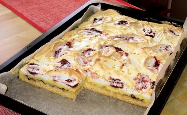 Z mléka, pudinků a krupicového cukru uvaříme pudink. Ušleháme sníh z bílků a cukru moučky. Na téměř upečený koláč nalijeme pudink a navrstvíme sníh. Ten můžeme ještě pokapat marmeládou, nejlépe višňovou. Zapečeme dozlatova.