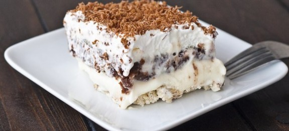 Vrstvíme: tvarohová plnka, vanilkový puding, čokoládový puding, vyšľahaná šľahačka a nakoniec nastrúhaná čokoláda