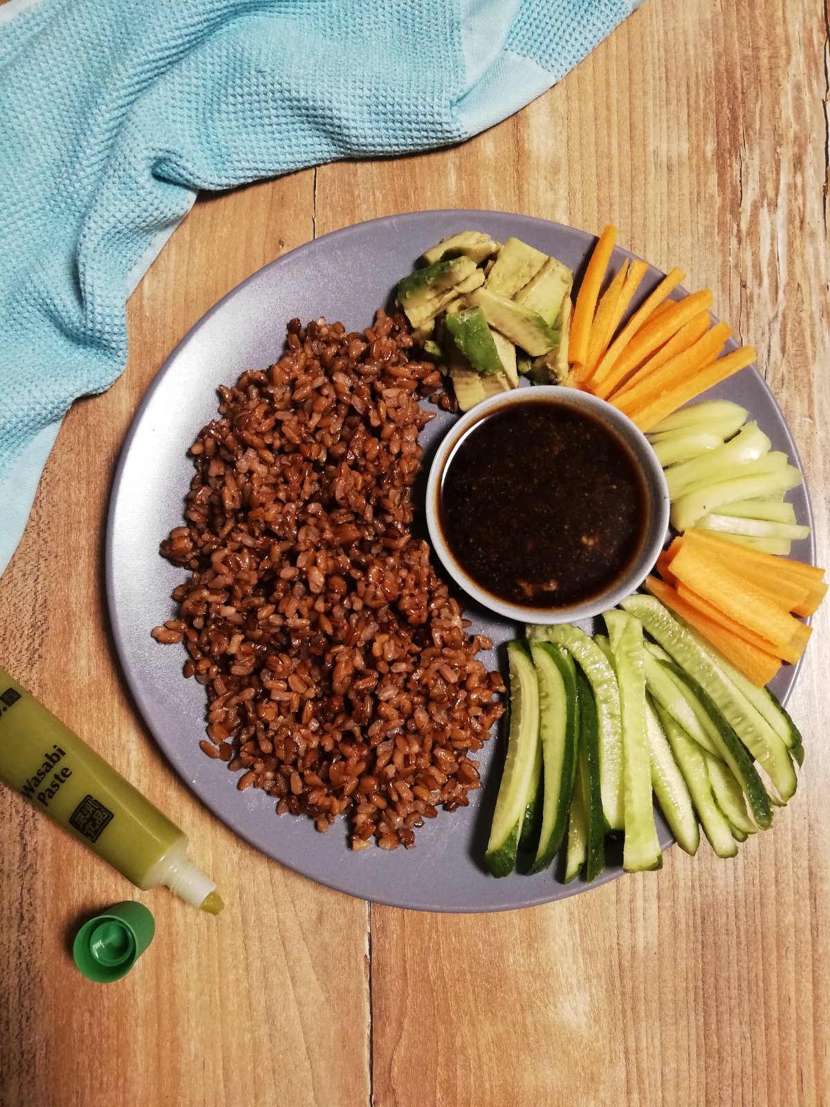 Bolo treba minúť zbytky uvarenej červenej RYŽE...a mala som chuť na sójovú omáčku a wasabi 💚💚💚... Niečo ako sushi na tanieri 😉