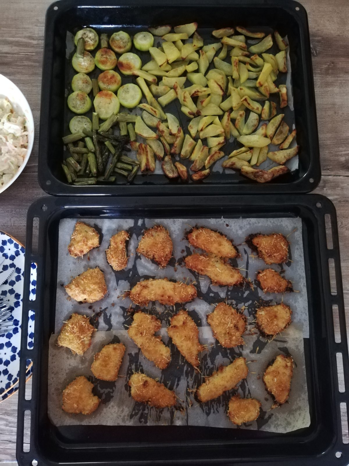 Do rúry som dala dva plechy, jeden s hranolkami a zeleninou, jeden s maskom. K tomu colleslav, dri si pochvaľovali