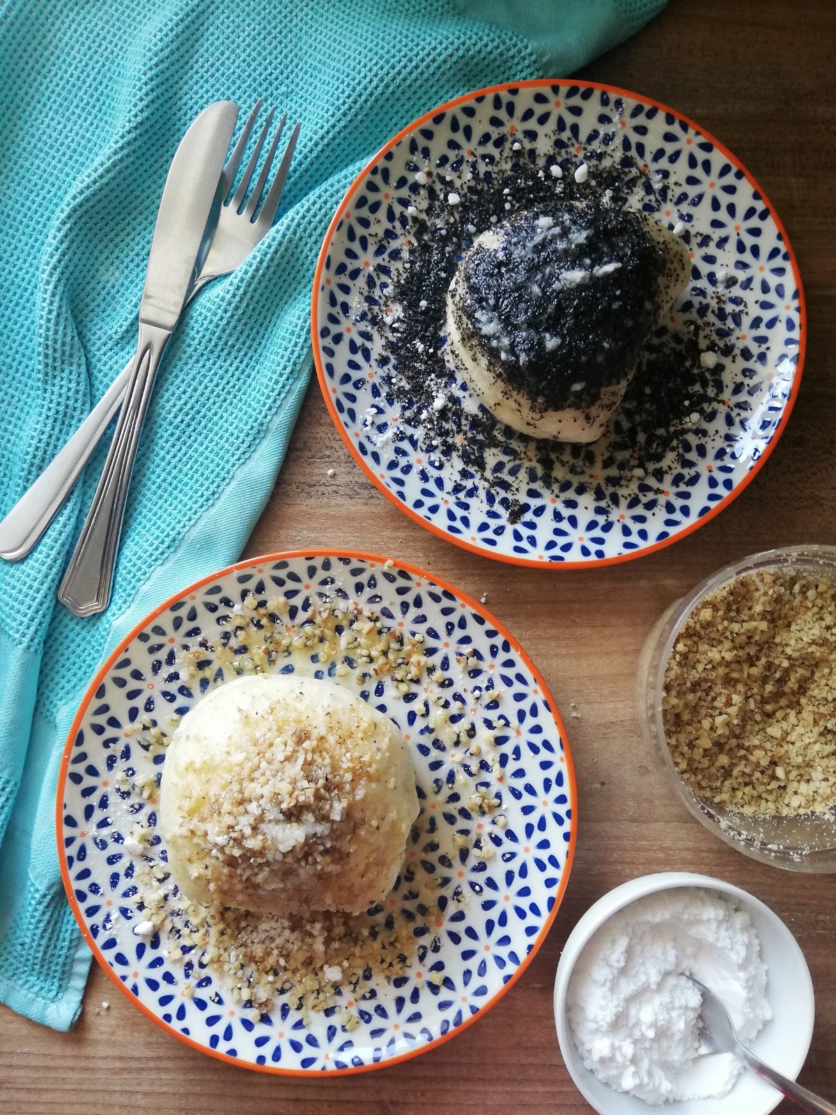 Postup: cesto vymiesime, necháme vykysnúť, na jemne pomúčenej doske ZĽAHKA (netlačiť na valček, aby cesto zostalo nadýchané) vyvaľkáme na cca 1 cm. Na vyvaľkané cesto si po jeho dlhšej strane nakôpkujeme plnku (lekvár, ovocie) - kôpky dávame tak od kraja, aby sme ich potom mohli PRELOŽIŤ (prikryť) cestom. Ja som mala pohárik s priemerom cca 4,5cm-5cm (šálka na espresso), chcela som ich menšie (mama robieva väčšie), takže som tie kôpky dávala cca 5cm od kraja. Kôpky teda prekryjeme cestom, pohárom vykrojíme, a tým sa nám pekne plnka uzavrie a cesto krásne spojí (toto som ja napríklad nikdy nerobila, urobila som štvorec alebo kruh, dala plnku a cesto som zatáčala). Buchty sú akoby v tvare písmena D, lebo tú preloženú časť už máme uzavretú, tam nekrájame.....Cesto si odrežeme do roviny a spravíme si ďalší pás s plnkami, a tak pokračujeme, kým cesto neminieme. Zvyšky, odrezky cesta využijeme tiež, jemne premiesime a znovu necháme podkysnúť, vyvaľkáme a urobíme buchty aj zo zvyšku. Buchty necháme podkysnúť cca 10 minút. Necháme si v hrnci prevrieť osolenú vodu pod pokrievkou. Do vriacej vody poukladáme buchty (buchty by mali mať rovnakú veľkosť), zakryjeme pokrievkou, ak je treba, stíšime plameň, aby nám to veľa nebublalo (ja mám indukciu, a stačil mi 3-4.stupeň). Stopneme si 6-7 minút. Na tie menšie priemery, ako som mala ja, to stačilo. CCa po 5minútach sme s mamou kontrolovali. Pichli sme vidličkou do jednej buchty, ako keby sme odškrabkali kúsok šupky 3mm, aby sme videli, že vnútro už vyzerá hotové. Ak ešte treba trochu času, tak znovu prikryť a pridať plameň, aby voda jemne vrela. Lebo tým, že hrniec otvoríme, uvoľníme paru, a voda zostane bez bubliniek. Keď je buchta hotová, povyberáme ich po jednej, jemne, najlepšie naberačkou s dierkami a riadne odkvapkáme od vody. Na tanieri do buchiet popicháme špajdlíkom, pekne hlbšie, akoby až k plnke, cca 2 vpichy do každej. A hneď ich potrieme roztopeným maslom. Potom už si zdobíme a dochucujeme podľa vlastnej predstavy.