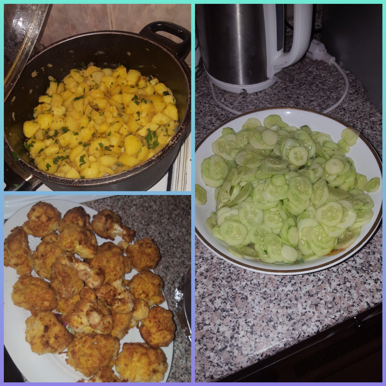 Dnes karfiol , zemiačiky už zo záhrady a uhorky😗😁mňam mňam😁😁😁
