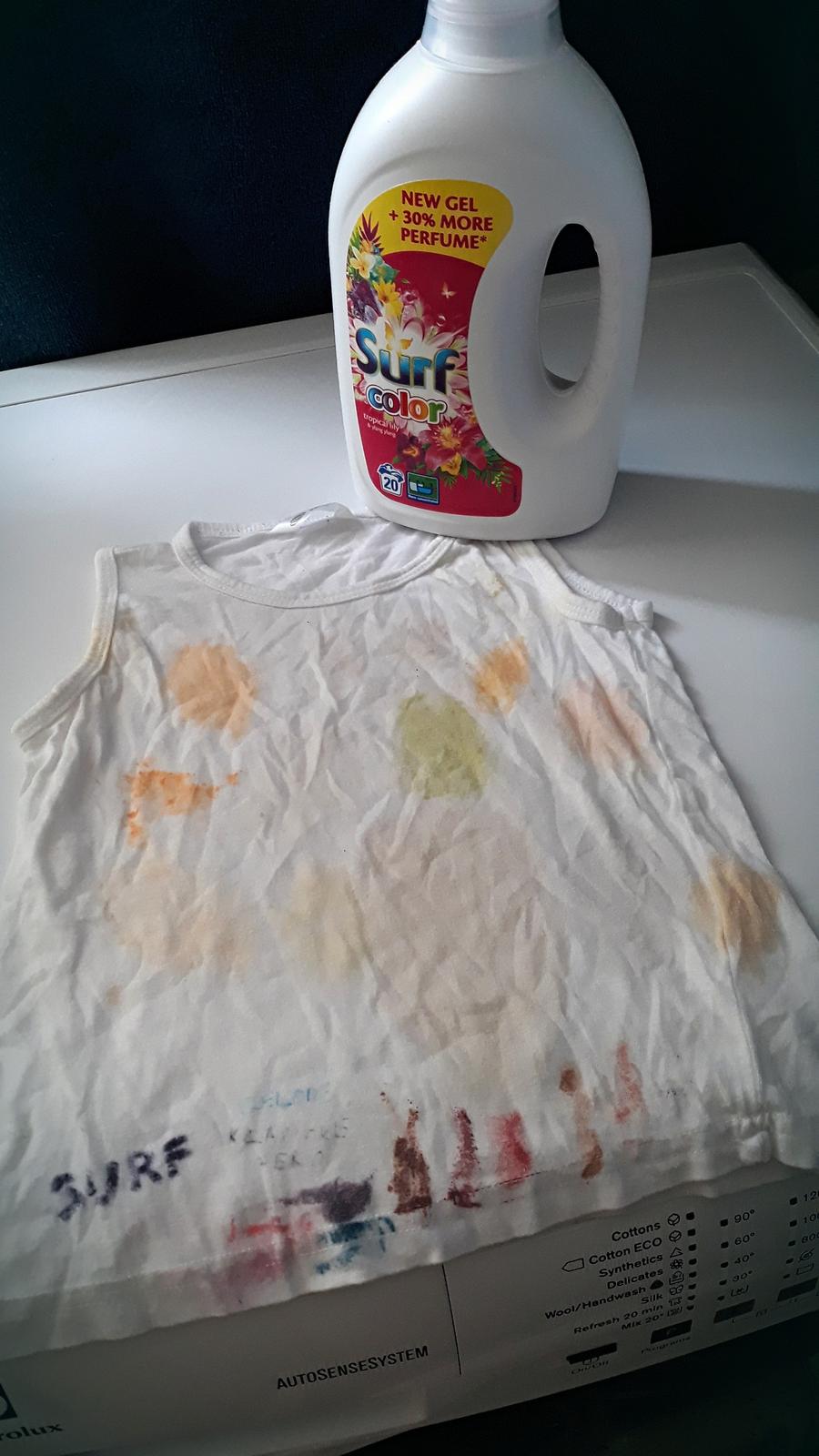 Na konci testovaceho druhého týždňa sme šli na náš nový dom. Keďže pomaly zariaďujeme a nemáme zatiaľ práčku, oprala som u babky s Coconut Splash Surfom a vyskúšala aj inú práčku. Veci boli zababrané od čokoládovej zmrzliny, pera, z pieskoviska a ihriska (biele psíkové tričko som zabudla odfotiť pred praním).